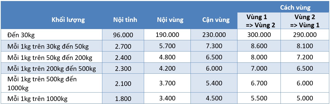 - Các nấc khối lượng trong bảng cước là khối lượng tính cước.