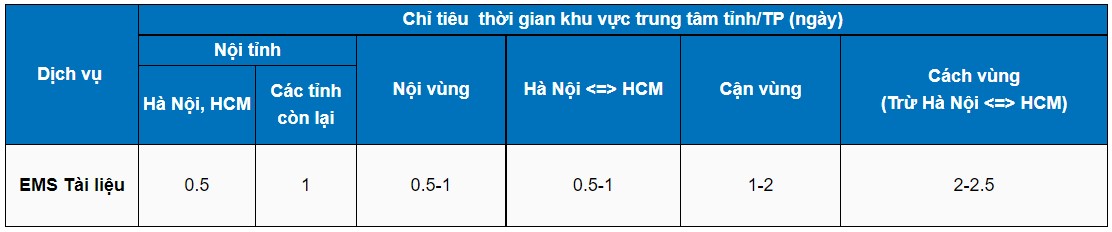 EMS Tài liệu là dịch vụ nhận gửi, vận chuyển và phát các loại thư, tài liệu trong nước theo chỉ tiêu thời gian tiêu chuẩn được Tổng công ty EMS công bố.