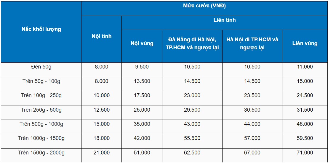+ Nội vùng: Áp dụng đối với các bưu gửi được gửi giữa các Tỉnh/TP trong phạm vi cùng một vùng.