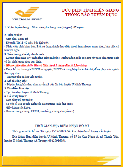 Bưu điện U Minh Thượng có nhu cầu tuyển dụng 7 bưu tá phát tại đại bàn các xã thuộc huyện U Minh Thượng, có cơ chế đãi ngộ tốt. Chi tiết xem...